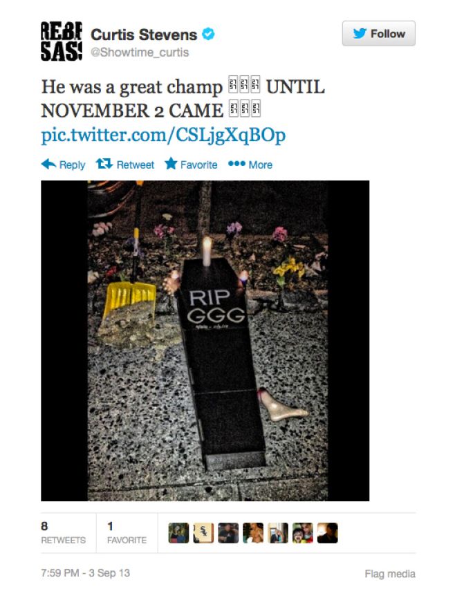 В своем Twitter он выложил снимок импровизированной "могилы" GGG с надписью "Покойся с миром" на надгробии и подписью "Он был великим чемпионом. А потом наступило 2 ноября".