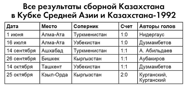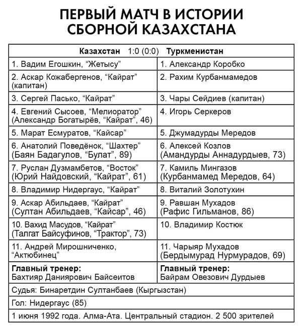 Из участников исторического матча с Туркменистаном самую заметную за пределами Казахстана карьеру сделал Нидергаус. В составе волгоградского “Ротора” он был одним из лучших нападающих чемпионата России 1990-х, забивал “Манчестер Юнайтед” на “Олд Траффорд”, а, вернувшись на родину, стал чемпионом Казахстана-2000 в рядах “Жениса”.