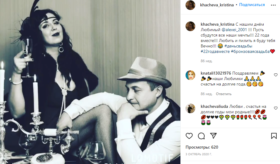 Из её постов известно, что Алексей родился 20 января, а годовщина у супругов — 3 октября. В этом году они будут вместе уже двадцать четыре года, и жена, по её собственным словам, его "пилит":