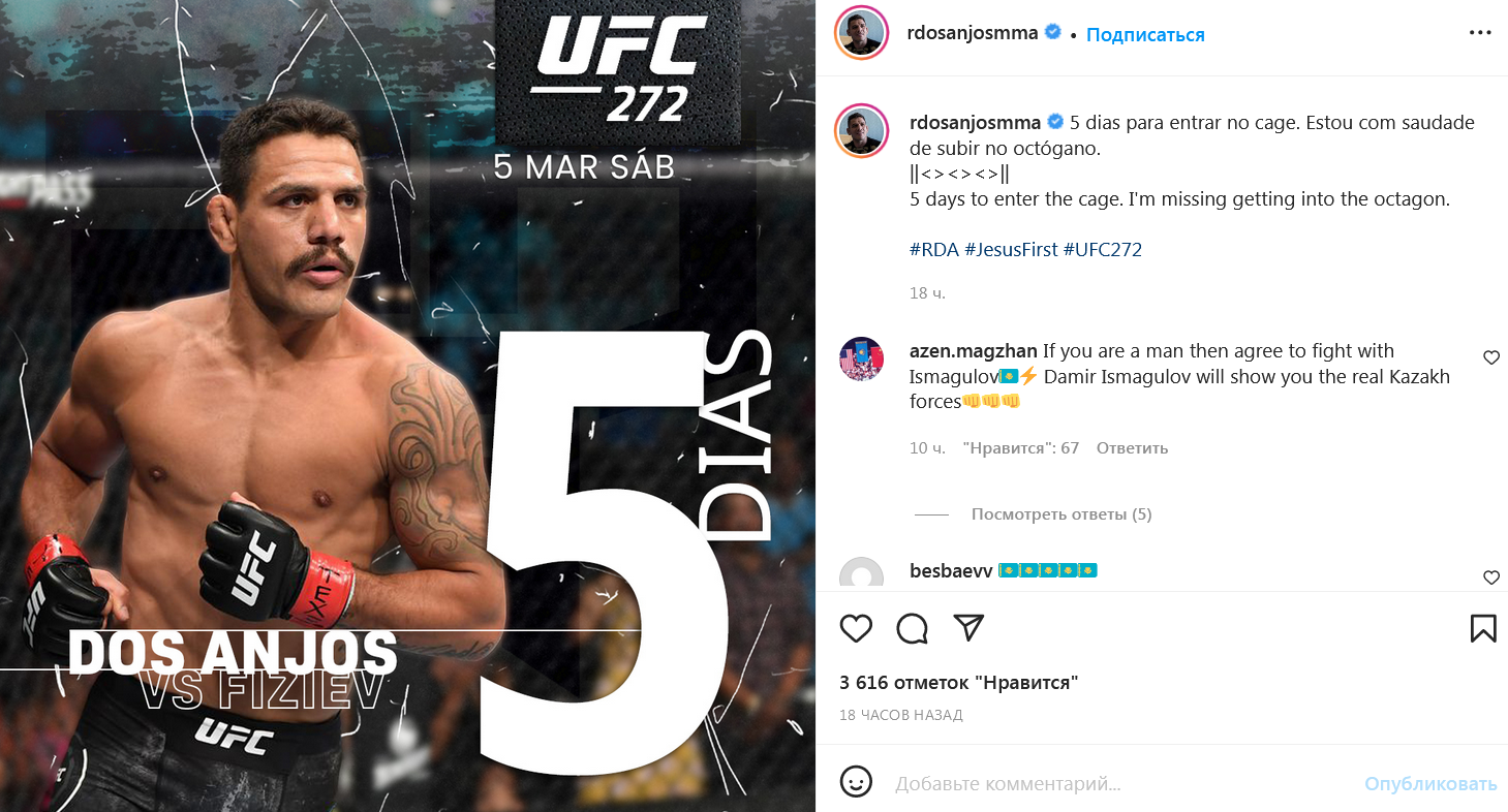 "Я на старте, Рафаэль Дос Аньос, и я уже в весе, просто подпиши контракт ! Сильно бить не буду. I'm ready", — написал Исмагулов в Instagram в подписи к коллажу из своего фото и фото Дос Аньоса.