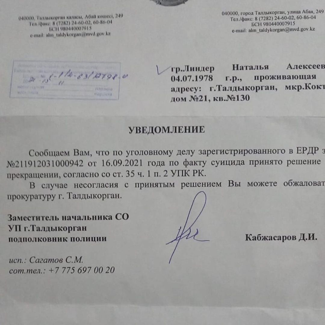 – Я была просто в шоке, но дело по статье 105 УК РК «Доведение до самоубийства» было закрыто в связи с недостаточностью доказательств. Следователь Самат Маратович Сагатов объяснил это тем, что на очной ставке Седов категорически все отрицал и не признал свою вину в том, что довел Альберта до самоубийства. Мне уже пришло официальное оповещение о закрытии дела, но до сих пор не укладывается в голове, что все спустят на тормозах и виновные в гибели моего сына так и не будут наказаны, — рассказала Наталья Линдер.