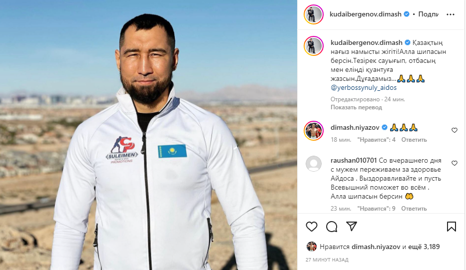 "Настоящий казахский джигит! Дай Бог здоровья. Поскорее выздоравливай и радуй свою семью и народ. Мы молимся…" — написал Димаш в посте.