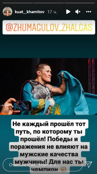 Казахстанец Куат Хамитов в сториз в Instagram подбодрил соотечественника, которого отправили в нокаут в последнем бою в UFC, передаёт медиа-портал Сaravan.kz.