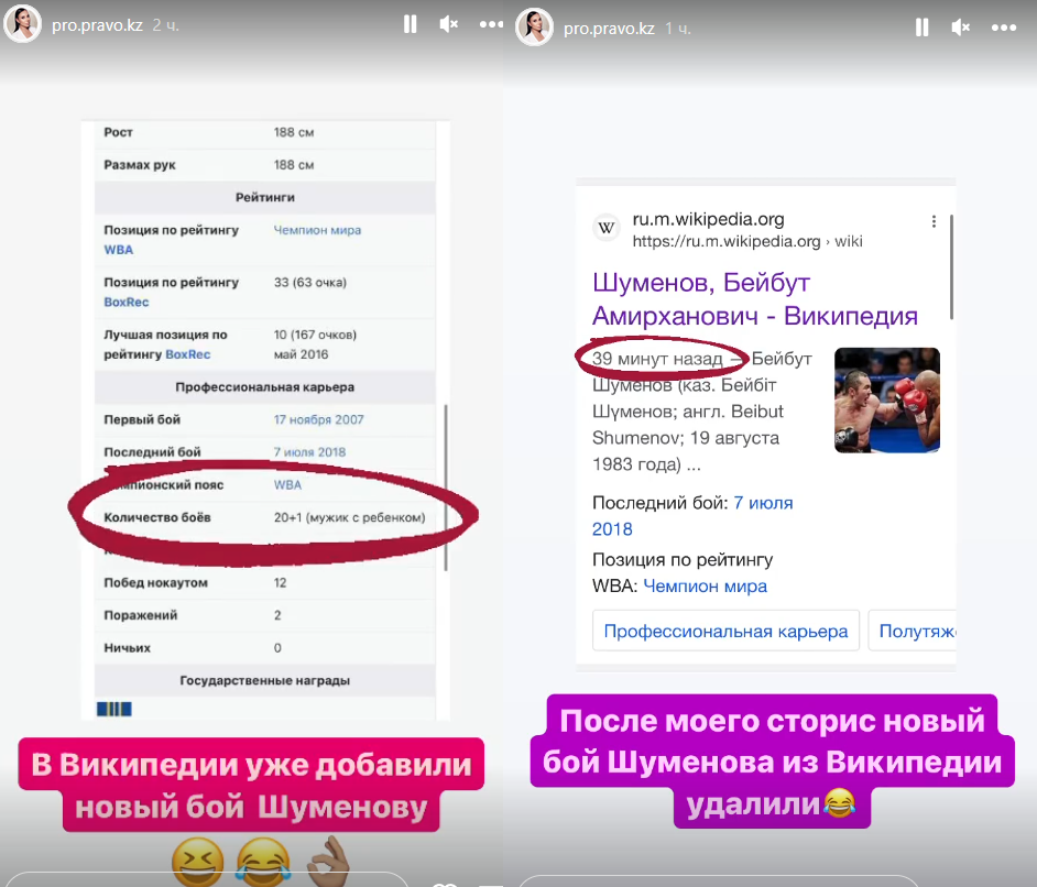 Известный юрист Анна Чернова обратила внимание на изменение, внесенное на посвященную Шуменову страницу Википедии. В списке боев Шуменова рядом с числом 20 появилась приписка "+1 (мужик с ребенком)". Вскоре правка была отменена.
