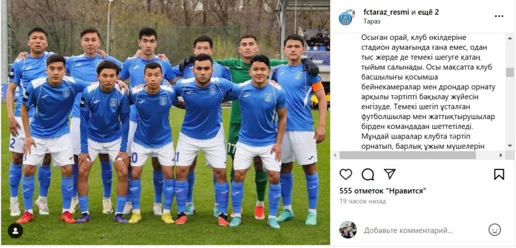 «Теперь представителям клуба запрещено курение не только во время осуществления тренировочного процесса или тем более матчей, но и за пределами стадиона. Для этого руководство клуба внедряет систему отслеживания дисциплины посредством установления дополнительных видеокамер и дронов. Футболисты и тренеры, уличенные в курении, будут немедленно отлучены от команды. Уверены, что такие меры позволят наладить дисциплину в клубе и превратят всех членов команды в постоянных сторонников здорового образа жизни», — заявил футбольный клуб «Тараз».