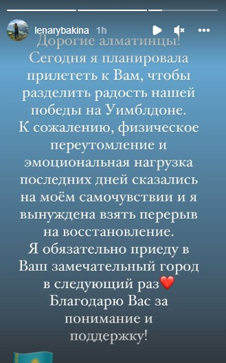 Спортсменка обратилась к поклонникам: "Дорогие алматинцы! Сегодня я планировала прилететь к вам, чтобы разделить радость нашей победы на Уимблдоне. К сожалению, физическое переутомление и эмоциональная нагрузка последних дней сказались на моем самочувствии, и я вынуждена взять перерыв на восстановление. Я обязательно приеду в ваш замечательный город в следующий раз. Благодарю вас за понимание и поддержку!"