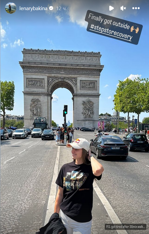 "Наконец вышла наружу #шагиквыздоровлению. P.S. Устала после 30 минут ходьбы пешком", — подписала она снимок, на котором позирует на фоне Триумфальной арки в Париже,