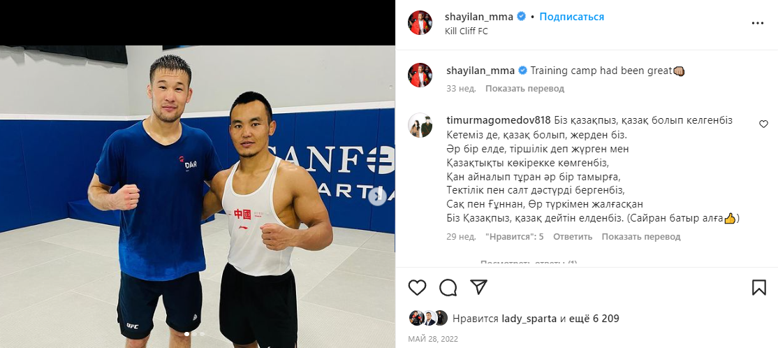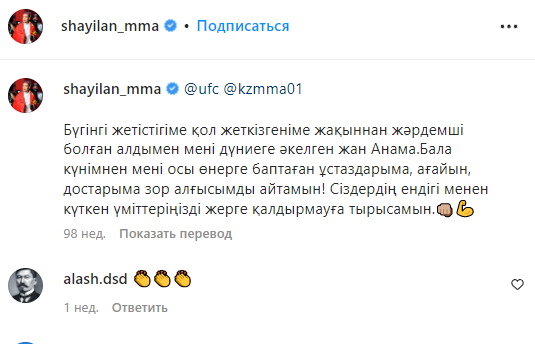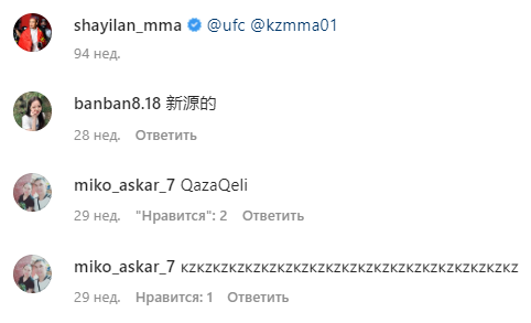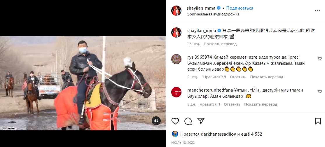 Также Нурданбек встроен в среду казахстанского спорта: его лайкают Дархан Ассадилов, Евгений Егембердиев и Аида Сатыбалдинова, он тренируется с Шавкатом Рахмоновым: