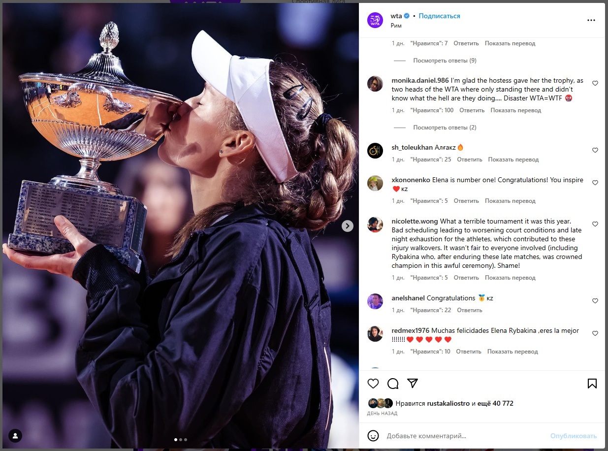 «Это какая-то шутка, а не финал «тысячника». Позор вам. Церемония вручения трофеев была скандальной и непрофессиональной. Вы даже не знали, кто из спортсменок Калинина, а кто — Рыбакина, перепутали награды, порядок вручения».