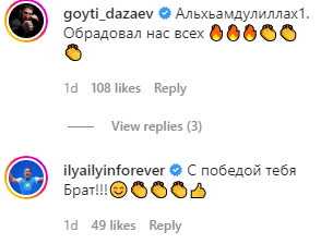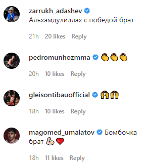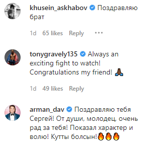 Казахстанцы поздравляют бойца Сергея Морозова на его странице в Instagram с победой над бразильцем, которому уступил другой наш спортсмен, передает медиа-портал Сaravan.kz.