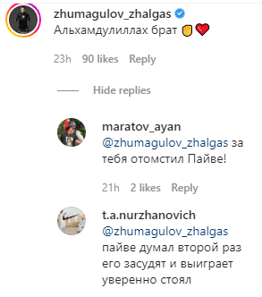 В воскресенье рано утром в Лас-Вегасе казахстанский боец Сергей Морозов победил на турнире UFC бразильца Раулиана Пайву, которому в своё время проиграл первый бой в лиге Жалгас Жумагулов. Казахстанцы радуются и поздравляют соотечественника с победой, среди них Жалгас Жумагулов, а также боец Гойти Дазаев и бывший тяжелоатлет Илья Ильин: