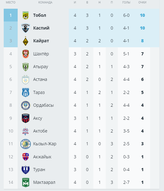 На первом месте "Тобол" с десятью очками, на втором — "Каспий" с таким же количеством, на третьем — "Кайрат" с восемью баллами, передает медиа-портал Caravan.kz.