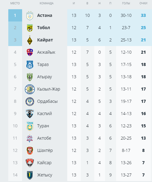 На первом месте остаётся "Астана", на втором — "Тобол", на третье поднялся "Кайрат", передаёт медиа-портал Сaravan.kz.
