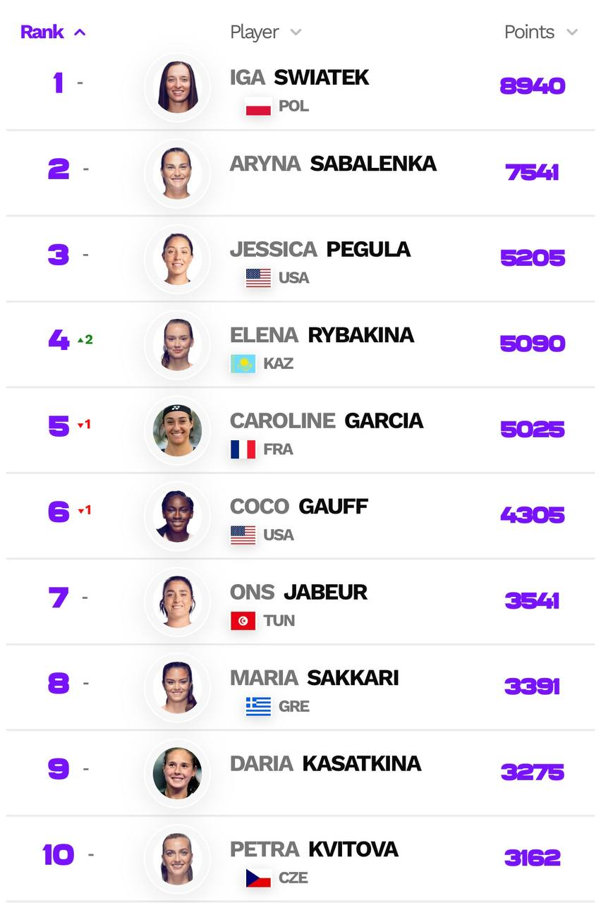 В обновлённом мировом рейтинге женской теннисной ассоциации Елена Рыбакина оказалась на четвёртой строчке, передает медиа-портал Сaravan.kz.