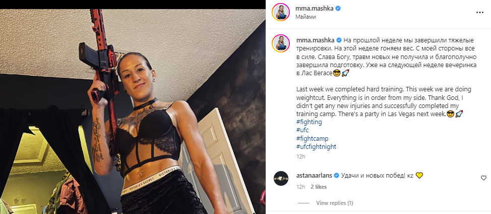 Казахстанская девушка-боец Мария Агапова на странице в Instagram высказалась о приближающемся поединке, передает медиа-портал Сaravan.kz.
