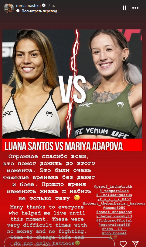 "Огромное спасибо всем, кто помог дожить до этого момента. Это были очень тяжелые времена без денег и боев. Пришло время изменить жизнь и набить не только тату", — написала Мария в Instagram.