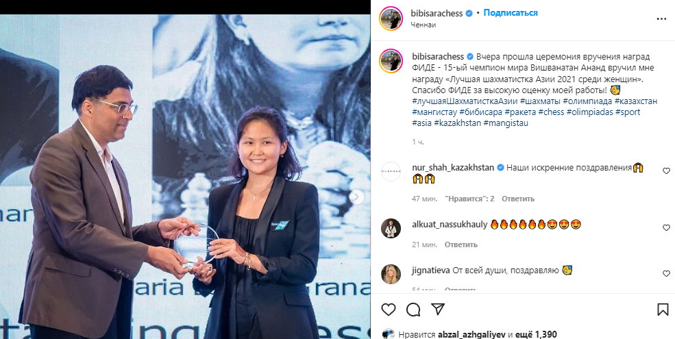 "Вчера прошла церемония вручения наград ФИДЕ — 15-ый чемпион мира Вишванатан Ананд вручил мне награду "Лучшая шахматистка Азии 2021 среди женщин". Спасибо ФИДЕ за высокую оценку моей работы!", — написала Асаубаева.