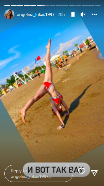 Казахстанская спортсменка поделилась фотографиями на пляже, на которых она в красном купальнике выполняет акробатические трюки. На одной фотографии девушка встала на мостик, а на второй — на руки, и развела ноги, демонстрируя растяжку.