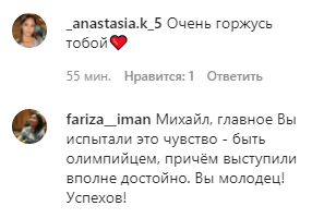"Я горжусь тем, что участвую в Олимпийских играх. Я остановился далеко от медали, но все же получил удовольствие от духа Игр. Стать олимпийцем — это мечта многих. Это определенно будет одним из ярких моментов в моей карьере," — написал Михаил.