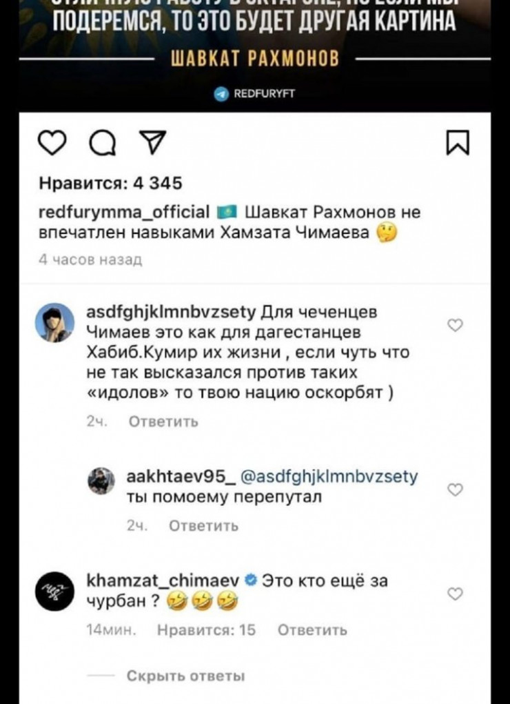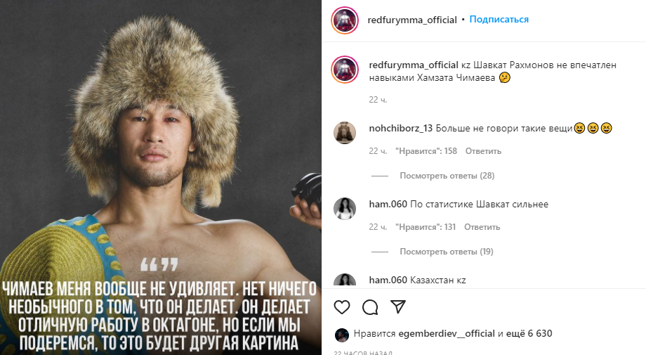 В группе redfurymma_official Хамзат Чимаев оскорбил в комментариях казахстанского бойца Шавката Рахмонова и удалил комментарий, передает медиа-портал Сaravan.kz.