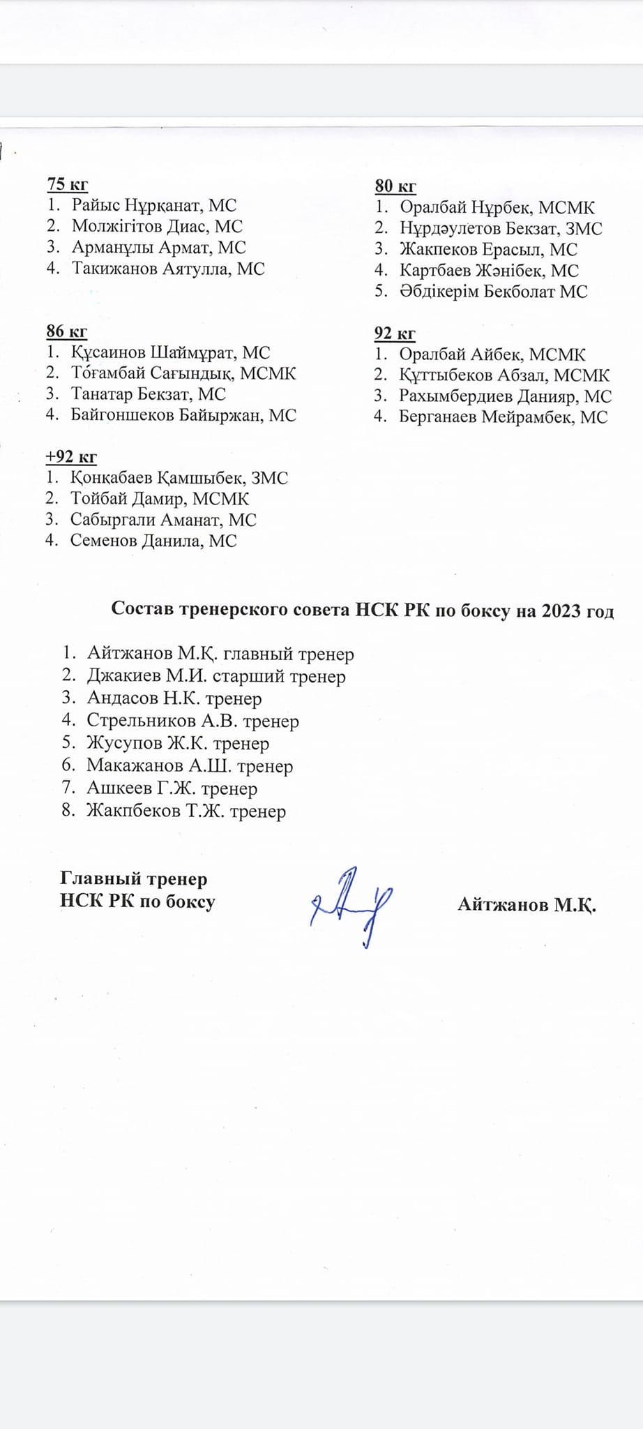 В Казнете появился документ со списком участников сборной по боксу, в котором указан новый главный тренер. Кайрат Сатжанов оставил свойй пост, новым главным тренером вновь стал Мырзагали Айтжанов, и именно он будет готовить команду Казахстана к Олимпийскими играм-2024.