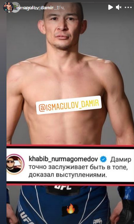 Этнический казах Дамир Исмагулов, выступающий в ММА, похвастался похвалой от Хабиба Нурмагомедова, сообщает медиа-портал Сaravan.kz.
