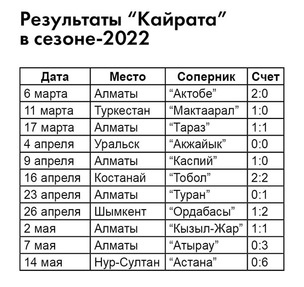 В 7-м туре “Кайрат” проиграл на своем поле “Турану” – 0:1, который до визита в Алматы занимал последнее место, не забив ни одного мяча. Эта неудача стала началом серии, в ходе которой команда Бердыева набрала всего одно очко из 15 возможных и рухнула в нижнюю половину турнирной таблицы. Самыми резонансными стали два последних поражения “Кайрата” – на своем поле от “Атырау” – 0:3, и в столице от “Астаны” – 0:6. Такие результаты команда позволяла себе и раньше, когда, гарантировав медали, доигрывала сезон молодыми ребятами из дубля. Но сейчас совсем иная ситуация. Сезон только набирает ход, а “Кайрат” выглядит абсолютно разобранным и безыдейным.