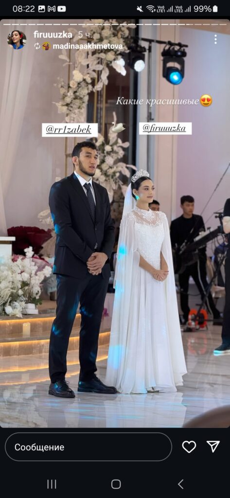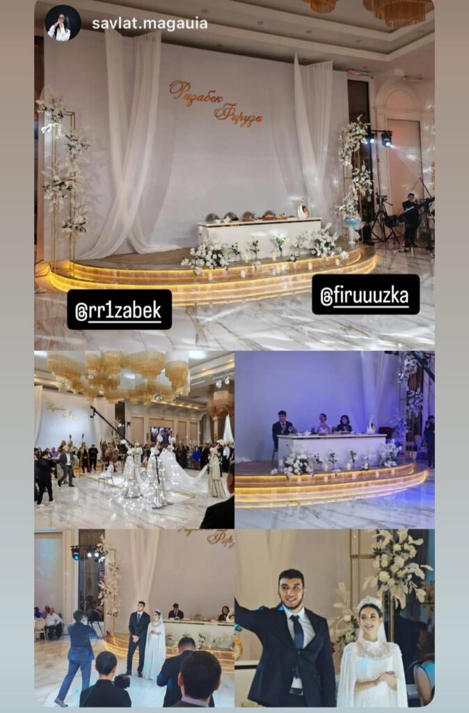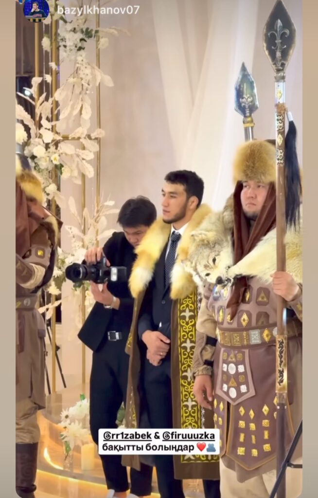 Торжественная церемония, судя по фото, оказалась торжественной и красиво оформленной, нарядными и элегантными были и сами молодожены — Ризабек Айтмухан в костюме и его невеста Фируза в длинном нежном платье с диадемой на голове.