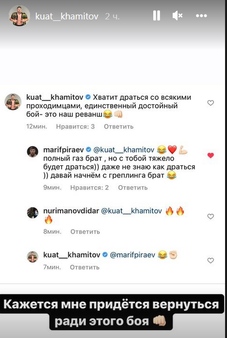 Куат опубликовал в своих сторис скриншот с диалогом, дописав: "Кажется, мне придется вернуться ради этого боя".