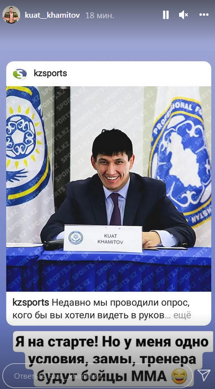 Победителем опроса стал боец ММА Куат Хамитов, который отрегировал на это в своих сториз.