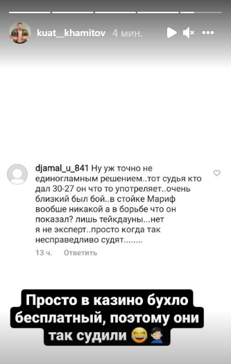 Казахстанец показал, что ему написали о том, что согласны с мнением, которое раньше высказывал Куат: ему показалось странным то, как один из судей в Сочи оценил его в разных раундах. Подписчик пожаловался на то, что поражение Хамитова не должно было быть единогласным решением судей, потому что со стороны Пираева не было однозначной доминации в течение боя. Также фанат казахстанца предположил, что один из судей принимал какие-то вещества, на что Хамитов ответил, что в казино была бесплатная выпивка, и этим объяснил такое судейское решение.