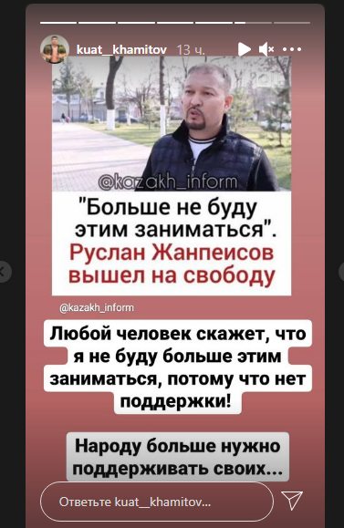 Казахстанский боец ММА Куат Хамитов отреагировал в сториз в Instagram на то, что Руслан Жанпеисов передумал заниматься общественной деятельностью, передаёт медиа-портал Сaravan.kz.