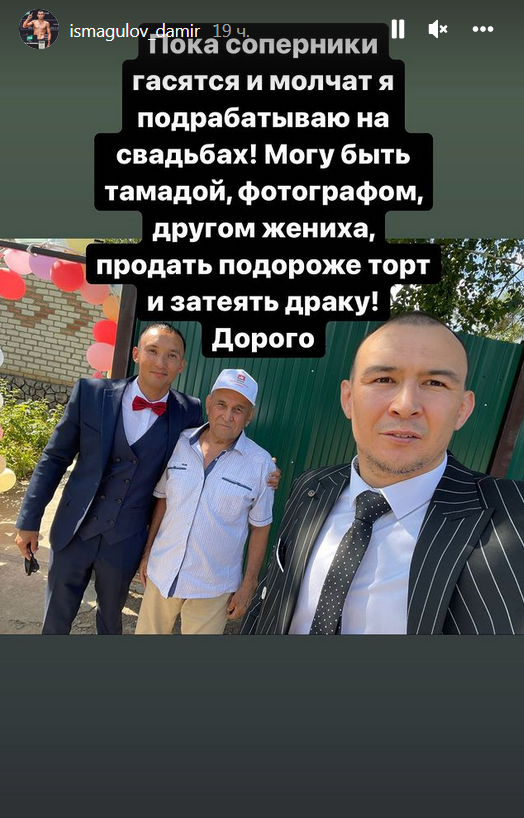 "Пока соперники гасятся и молчат, я подрабатываю на свадьбах! Могу быть тамадой, фотографом, другом жениха, продать подороже торт и затеять драку! Дорого", — в шутку написал Дамир после очередного посещенного тоя.