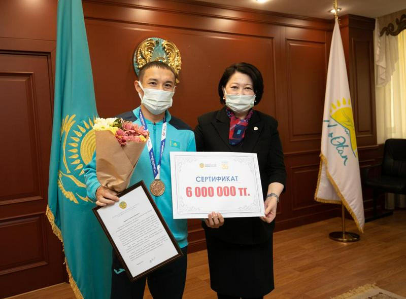 После этого министр культуры и спорта наградил тренеров и боксеров, выполнивших звания заслуженного тренера Республики Казахстан и заслуженного спортсмена Республики Казахстан в соответствии с нормами и требованиями присвоения спортивных званий, разрядов и квалификационных категорий победителям и призерам чемпионата мира.