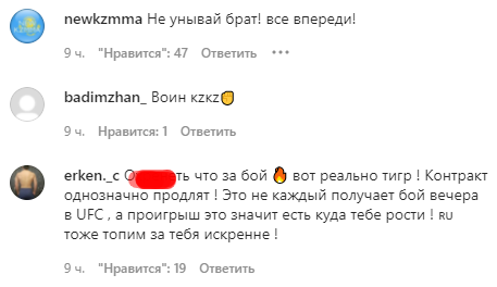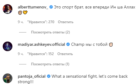 Казахстанский боец обратился к соотечественникам после боя и выложил видео у себя на странице. В нём он говорит, что хорошо подготовился, и пообещал в следующий раз вернуться уже сильнее.