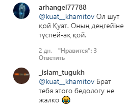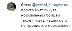 "Хочу наказать этого парня, зря ты ворвался в клетку и полез в разборки настоящих мужчин! Я не Александр Емельяненко и надеру тебе зад…цу… На кону стоит все, выбирай любую площадку, посмотрим, что из себя представляют парни из поп ММА," — написал недавно Куат Хамитов, таким образом бросив вызов Артёму Тарасову. Но большинство людей в комментариях этого не оценили.