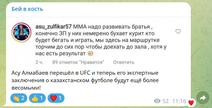 «ММА надо развивать, братья. Конечно, ЗП у них немерено. Бухают, курят. Кто будет бегать и играть. Мы здесь на маршрутке торчим до сих пор, чтобы доехать до зала, хотя у нас есть результат», — написал тогда Алмабаев в соцсетях.