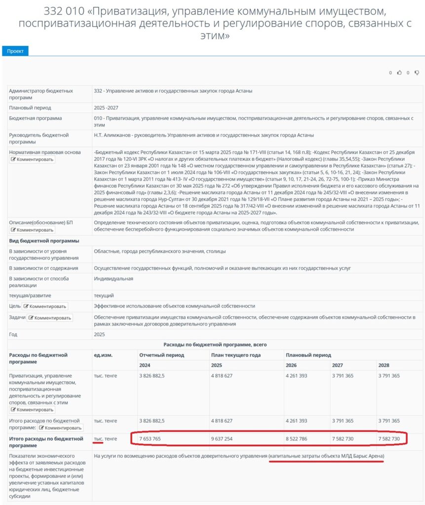 В графе «Показатели экономического эффекта от заявляемых расходов на бюджетные инвестиционные проекты, формирование и (или) увеличение уставных капиталов юридических лиц, бюджетные субсидии» указано: «На услуги по возмещению расходов объектов доверительного управления (капитальные затраты объекта МЛД Барыс Арена)».