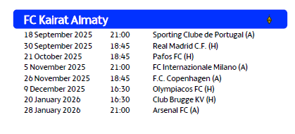 На домашней арене в Алматы «Кайрат» сыграет против мадридского «Реала», бельгийского «Брюгге», греческого «Олимпиакоса» и кипрского «Пафоса». Гостевые матчи «Кайрата» состоятся против «Арсенала» в английском Лондоне, «Интера» в итальянском Милане, «Спортинга» в португальском Лиссабоне и «Копенгагена» в одноименном городе Дании.