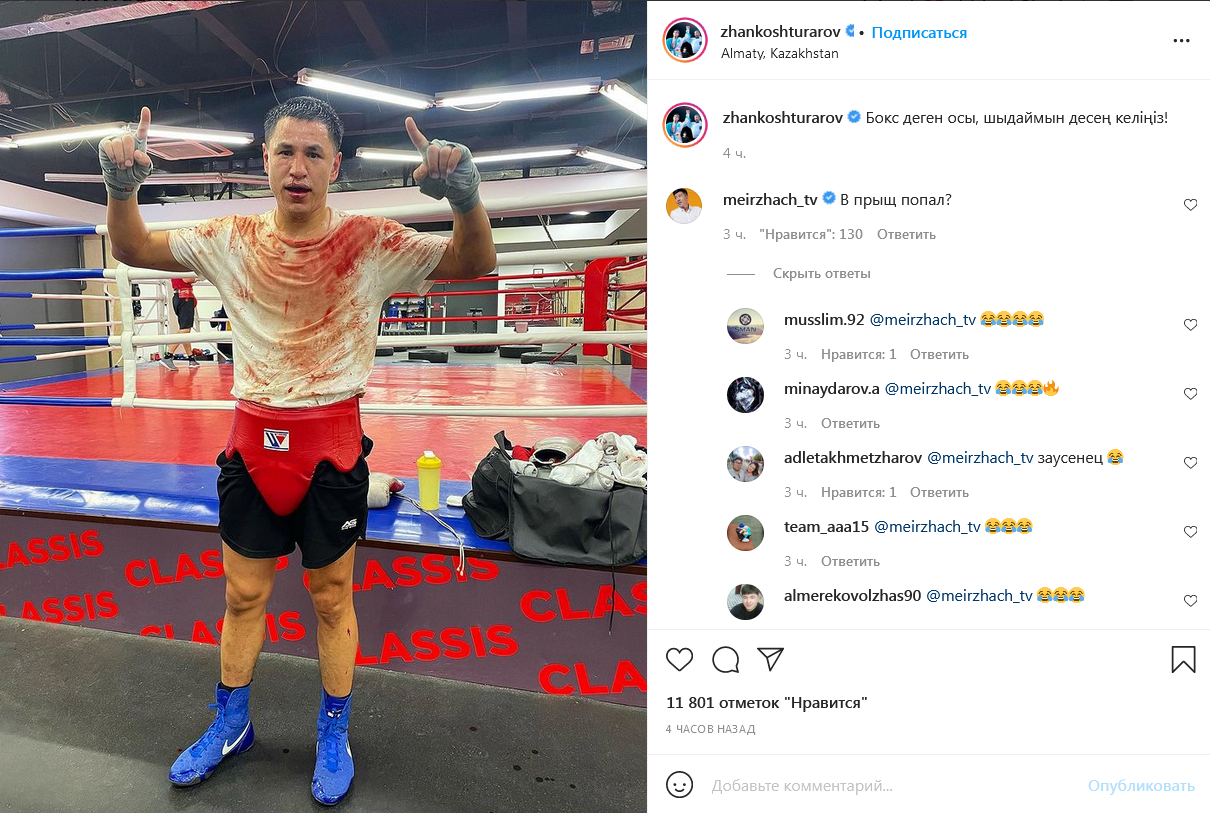 Снимок подписан так: "Вот это — бокс, приходите, только если уверены, что выдержите". Первое сообщение под фотографией оставил известный актер и комик Мейржан Туребаев, супруг певицы Даны Есеевой. Он рассмешил многих других пользователей, написав: " В прыщ попал?".