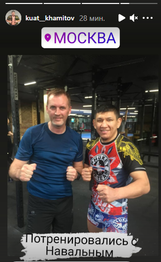 Казахстанский боец ММА Куат Хамитов сообщил в сториз в Instagram, что потренировался с Навальным, передаёт медиа-портал Сaravan.kz.