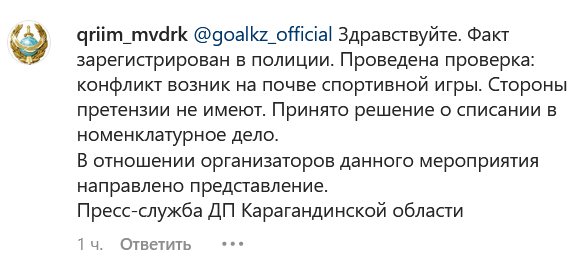 "Факт зарегистрирован в полиции. Проведена проверка: конфликт возник на почве спортивной игры. Стороны претензии не имеют. Принято решение о списании в номенклатурное дело.