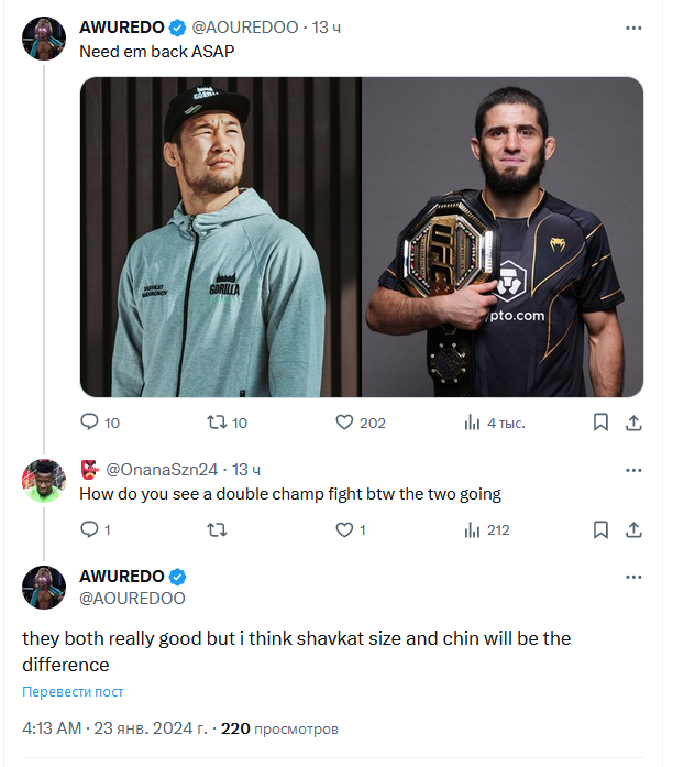 Аккаунт AWUREDO в социальной сети X посвящен ММА, его автор пристально следит за этим видом спорта и живо интересуется карьерой Шавката. В комментариях его спросили, кто, по его мнению, выиграет в поединке Махачев — Рахмонов.