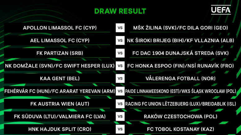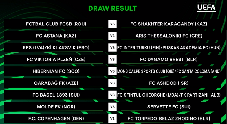 "Шахтёр" сыграет против команды из Румынии ФК ФЦСБ (бывшая "Стяуа"), соперниками "Астаны" станет команда из Греции "Арис", а "Тобол" сыграет против хорватского "Хайдука".