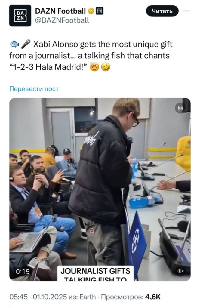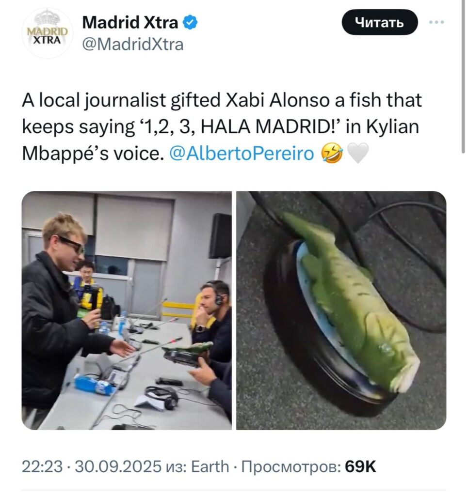 «Почему рыба? Хаби Алонсо любит рыбалку. Мы решили, что дарить удочку слишком банально. Нашли говорящую рыбу, а потом пришлось искать ещё и мастера, который заменил плату и заставил её говорить голосом Мбаппе. Хаби оценил подарок и после прессухи подошёл к Виталику — пожал руку. Судя по видео Marca, сотрудники Реала увезли трофей в Мадрид», — рассказал российский блогер.