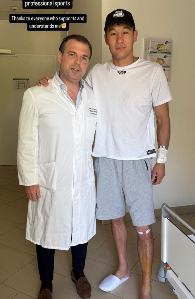 В день боя казахстанец опубликовал фотографию из больницы, показав, что лечение колена и реабилитация еще продолжаются.
