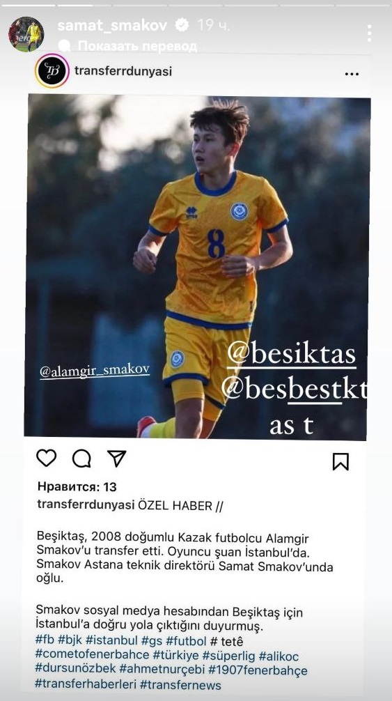 Информацию о том, что Аламгир перебирается в Турцию, выложил на своей странице в Instagram его папа Самат. Сообщается, что новым клубом Смакова-младшего станет турецкий "Бешикташ".
