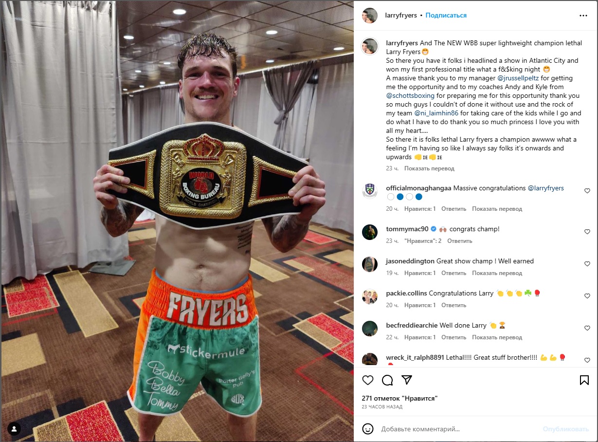 Итак, вот оно, ребята, смертоносный Ларри Фрайерс — чемпион, о-о-о, что за чувство у меня такое, как я всегда говорю, ребята, это движение вперед и вверх».