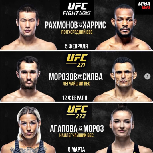Мария Агапова на странице в Instagram выложила расписание боёв казахстанцев в UFC в ближайшие три месяца, передаёт медиа-портал Сaravan.kz.