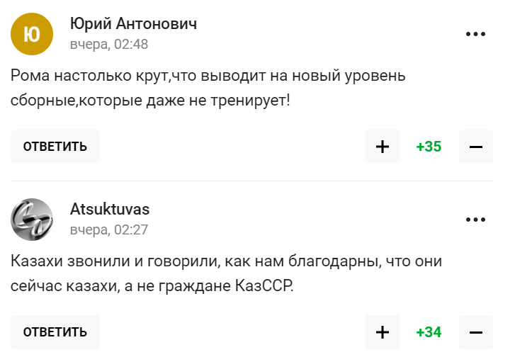 Отметим, что слова "о благодарных казахстанцах" вызвали шквал самых разных и большинстве своем нелестных реакций в комментариях под этой новостью на странице sports.ru.